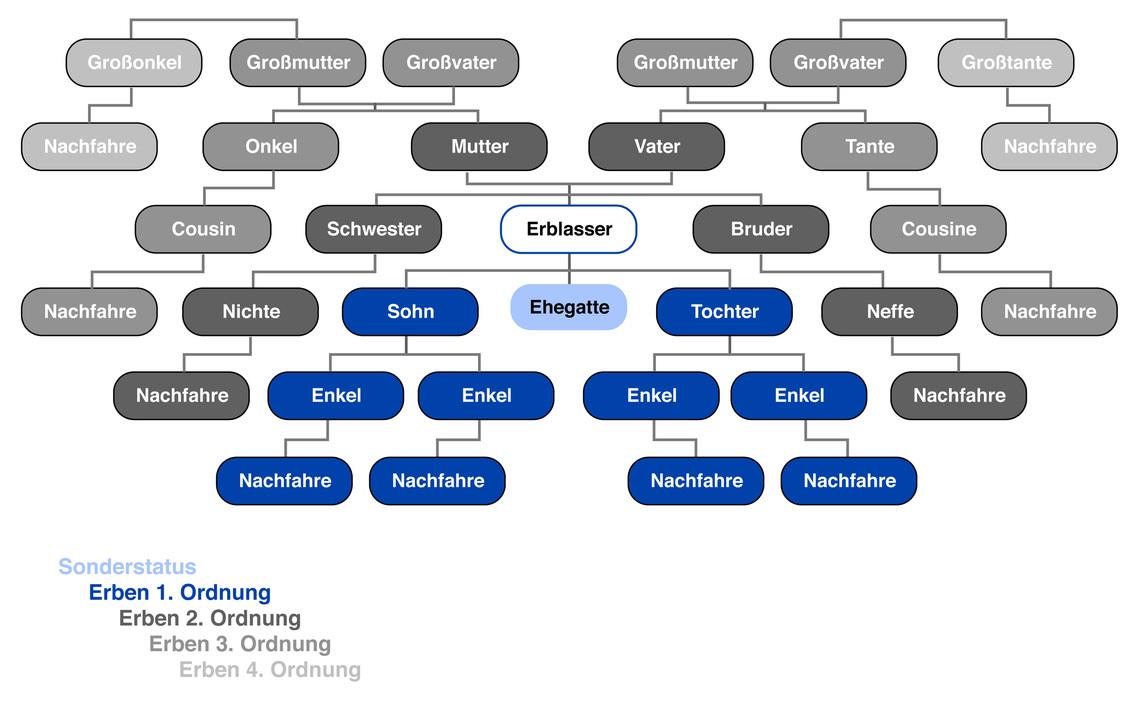 Einen besseren Überblick zur gesetzlichen Erbfolge bis zur vierten Ordnung gibt die folgende Grafik.